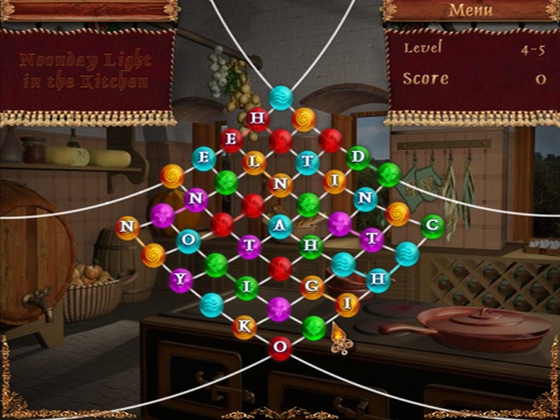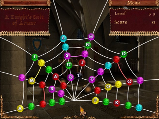 For all the gravity of its backstory, the game is childishly simple, the sort of game I'd give to tiny tots. There is a spiderweb. Beads of different colours can be slid over its threads to line up three or more of the same colour, which will then go poof, more beads moving out from the centre of the web. Some beads have letters on them, and these beads must absolutely be made to go poof, so that the letters, freed from the web, will move to the top right corner to make a word of phrase; for example, "pathway" or "fulvous hut". Once all letters are free, the object of that description will then appear: there, another bit of Rainbow Kingdom freed, and a great way to teach children new words, although, "fulvous hut"?