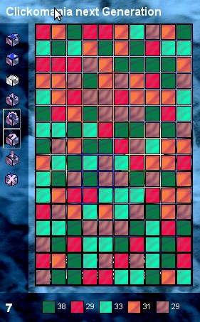 The idea is to make a chain of identical blocks adjacent to each other disappear by clicking on any block in the chain. The blocks don't have to be in straight lines, just as long as their sides are touching. As they disappear, the blocks above them fall down, sometimes forming new chains, or breaking up old ones. SameGame could be called a variation on Tetris, since the objective is to clear the game board, only the board is already filled instead of having blocks drop in it. There are variations in the implementation, though. Firstly, are points awarded for clicking away the longest possible chain, or is the main objective to completely clear the board? Clickomania bases the score only on how much blocks have been cleared; most game implementations do count chain length, MaciGame even basing its sound effect on it. Clicking on a minimum-length chain produces a "twirly-doop" sound, a longer chain goes "twirlytwirly-doop" and a really long chain snaking its way all over the board will disappear with a satisfying "twirlytwirlytwirlytwirlytwirlytwirlytwirlytwirly-doop!". It is possible that this sound effect alone was responsible for the extremely addictive nature of MaciGame.