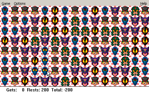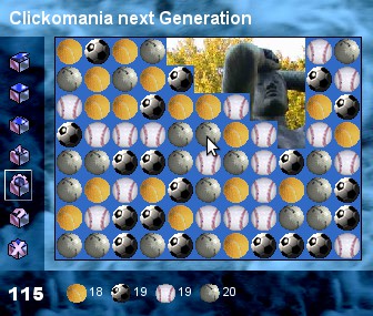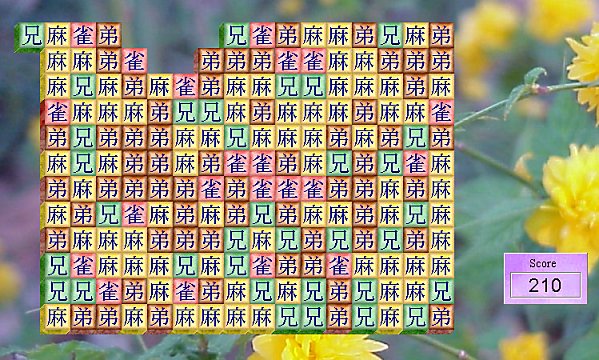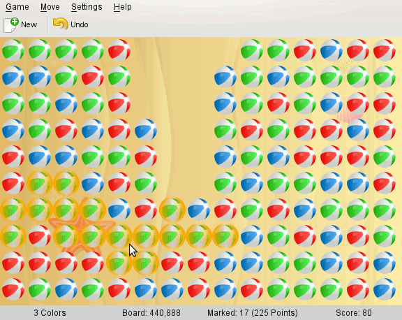 Secondly, what are the graphics, and are they skinnable? (Here is where it gets interesting to fans and modders.) Potentially customizable features are: how big is the gameboard, do the blocks have colours or graphics, how many different colours/graphics are used in one gameboard, is it possible to change the graphics by loading a different tileset, does the game reward the player with a background image, is it possible to load the image of one's choice (like one's favourite anime character), and do the blocks in a chain display an amusing animation when the mouse hovers over them? MaciGame accepted custom tilesets - though no background image, as the background was a tile in the tileset image - where each tile had a "normal" and a "hover" graphic. The artist who made three Gatchaman-based tilesets had the characters' expressions turn to horror when they realized they were in a chain about to disappear. But how do the other games compare?