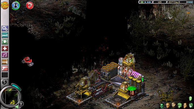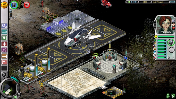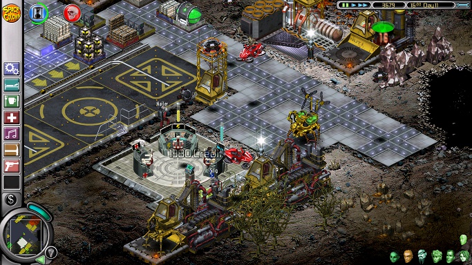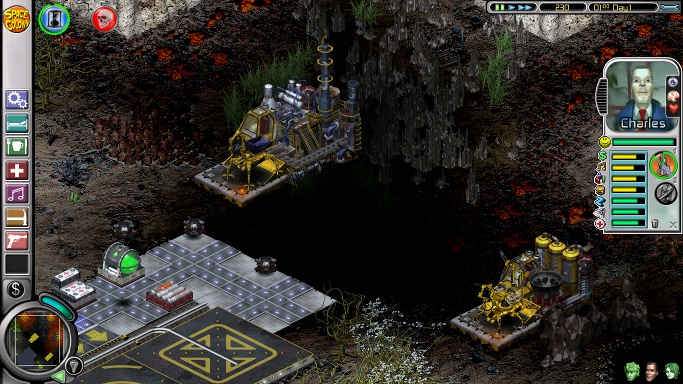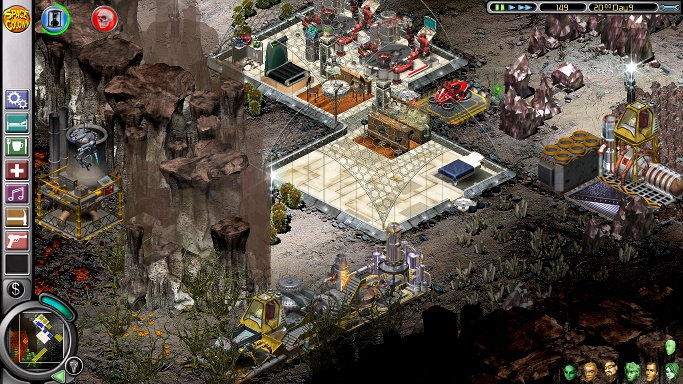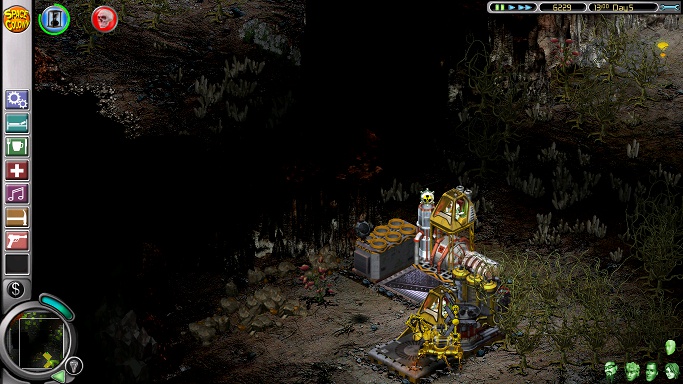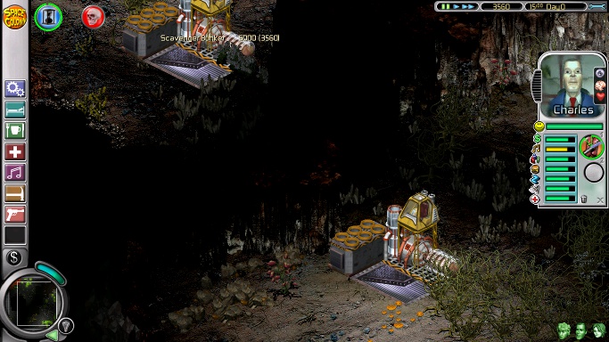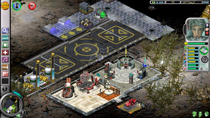 The second mission starts on an almost completely dark planet with the first three colonists: Ashia, Nailer and the next-to-useless Greg. There should be enough money for essentials like beds, a shower and somewhere to eat, while providing Greg with a jacuzzi and social area are a prerequisite to making him do any work at all. He can man oxygen until his place is taken by the equally useless Babette, who will arrive later with the other six. However, the most important matter to attend to is the destructive nasties on the right side of the screen, and it's worth it to pause the game, sell a lot of iridium and buy three to six commando posts to plant in some safe spot before sending the commandos running into the darkness. After that, delete the tourist port, put down some space bike posts and extend the base as needed before the stupid rodents get in the way of building by hopping all over the place. Next, put a weeding post next to a photocyn-illuminated podulus plant for Nailer, light up the area around the base (but don't light up any patches of pyrocyns or Nailer will kill himself trying to "weed" them) and place a harvester near the base for Ashia. Optionally, build a tourist complex without any airlocks, so the tourists can't bother the colonists.