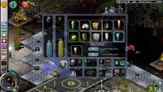 Let Barbara do her bit and watch the weeders. When the space bike lifts off, it's clear that Charles has finished his patch. If Charles and Venus weed together, they will simply follow each other blasting the same weedy spot, which is why they were separated; so when Charles is done, sell his weeding post and let him mine titanium (an expensive ore, which will pay for the android-making supplies) while Venus finishes alone. There should be enough money now for a titanium miner and a nutrient harvester; on Day 1 some supplies will have been dropped off, which can be sold. The titanium miner goes right up against the titanium crystals and as far to the left as possible, leaving some space between its back and the stony patch so that the mining bot can walk all the way around the miner without being forced to go through lava. The nutrient harvester, so as not to be in the way of future warehouses, goes against the big silicon crystal above the lake. Venus goes there to clear space when she's done weeding, which is when the flamethrower reappears in her weeding post, and on Day 1, between Hour 6 and Hour 10. The second weeding post can also be sold; they should both fetch more than 100 credits.