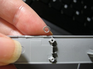In closing, a picture of the central pivot point of the mouse button, shown below. The remarkable thing is not that there are two central pivot points and a central pivot bar, corresponding with the central holes shown in the two pictures above, but that the topmost point, which is placed over a larger hole than the bottom point, has a thin plastic ring around its end that came off quite easily when the plastic bar was handled. Is this ring just a bit of junk left by the production process, or necessary to prevent the pivot point getting jammed in the hole it is placed over? Anyway, it came off, and the mouse button still works fine.