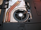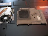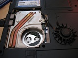 Also, laptops not being meant to take apart, their components are usually deeply buried. The ventilator is easy to spot, though. The cover is attached with a few screws and comes off easily. Ditto the black plastic ventilator, which is attached by three screws. Not visible in these pictures: to stop the tiny screw rolling away and getting lost, I had the laptop on a big wooden tray and put the screws in the screwdriver case.