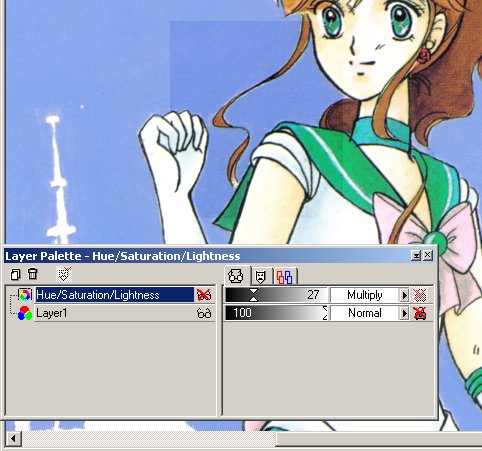 My method uses layers - present in Paint Shop Pro version 5 and up - and preferably adjustment layers - present in Paint Shop Pro 7. When the scan is straightened, cropped and at its final size, I'm going to add an adjustment layer of the type "Hue-Saturation-Lightness". I'm not even sure whether the type of layer matters, since I'm not going to change the HSL settings. Instead, I'll change the layer blend type from "Normal" to "Multiply". Whoa, now the image is a lot darker; but the Multiply method ensures that white stays white. Since the image is now too dark, I'm going to move the adjustment layer's transparency slide to the left until the colour enhancement matches the physical doujin cover's colours as closely as possible. In practice, the adjustment layer will be almost completely transparent. Then I merge the layers to transfer the improvement to the scanned image. In Paint Shop Pro 5, a similar result can be had by making a new layer, flood-filling it black, setting the blend type to "Burn" and moving the layer's transparency slider until the colours are right; like the solution with the adjustment layer, this darkens colours based on their original value, so white stays white.