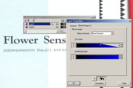 As an introduction to the topic of blend ranges, I'm going to explain how I made scans of manageable filesize from a doujin printed on pastel blue paper. The initial full-colour scans from the DJ were huge files, partly because of the colour depth and partly because the blue background wasn't uniform, but murky and mottled with grey. In the lossless compression of the PNG format, every colour change between one pixel and the next means a larger file, so I want the background to be as evenly coloured as possible. This also applies to B/W scans, where the Highlight/Midtones/Shadow adjustment was used to whiten the greyish background. That adjustment won't have the same effect in a coloured image, and greyscaling it - changing the pastel blue to its equivalent hue of grey - leaves me with a background so dark that adjusting the highlights back to white will bleach all detail out of the image. I specifically need to remove the colour before I clean up the scan.