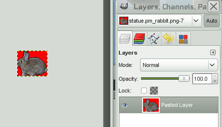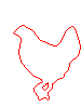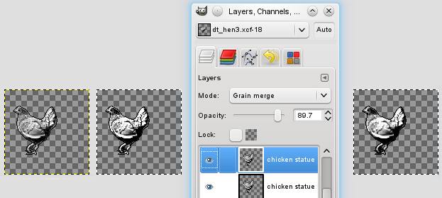 Of the chicken figurine image, the outline will be the most transparent, so I'll add a new layer under the chicken, flood-fill it with the colour I'd like the outline to have, and add a new layer above the chicken where I chip away at its shape in a different colour until the shape looks right - just as when I isolated the original chicken image from its background. Then, these three layers are merged and the background is selected and deleted. (Remember that antialising should be OFF when selecting the background colour, or the outline is made partly transparent again, and the effort will be wasted.)