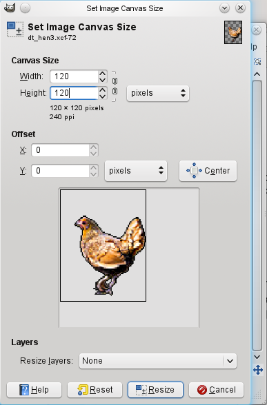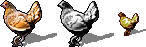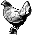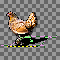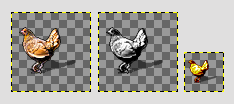 Now comes a difficult moment: shrinking the image. As the other two tiles need to be shrunk too, I shrink the layered image file by 75%, save, shrink again by 50% and save to "figurine.pm_chicken.png". The result is... oh, my.