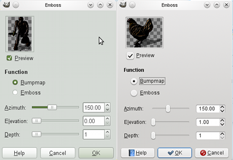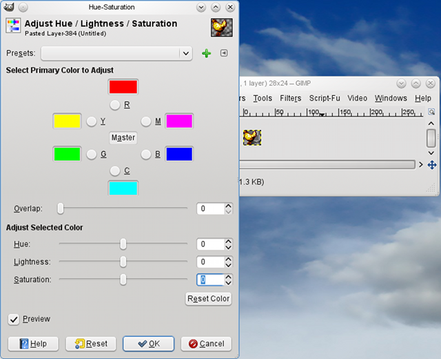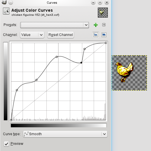 Now, the figurine tile should be finished, although it's bright enough to hurt your eyes. But while I was cleaning up the dragon tiles, I found a way to tone the bright figurines I'd been making down to the existing figurines: in GIMP, go to Colors, Hue-Saturation, and decrease saturation with the slider or by typing a negative number in the box. The value "-20" generally works, although for the chicken I used "-40". Alternatively, a solution I only discovered after making a pile of figurines and then desaturating them: I should have reduced the transparency of the burn layer just after adding it, and before doing the rest of the processing. This dulls the shine without darkening the colours too much.