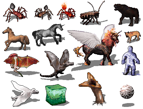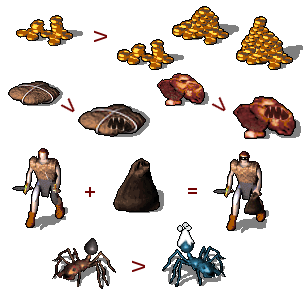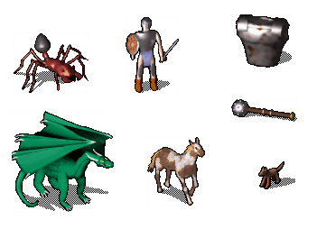 In a few lucky cases, the image can and in fact, for the sake of consistency, must be based on already existing graphics. The killer food ration, killer tripe ration and killer piles of coins would lose their significance if they looked totally different from what they try to mimic. And the rogue, plus mask, minus one sword, plus oilskin sack makes an ideal mugger. Not to mention that the snow ant should be in keeping with the rest of the ant family. (Far from being a mirrored recolour, this cyanide-blue ant involved remaking the shadow and repixelling the outline.)
