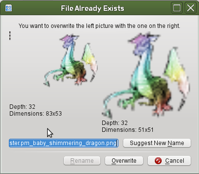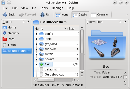 This is very simply solved by deleting the extra pixels that made the tile too large, re-cropping the tile, changing the coordinates in the tiles conf, and optionally submitting the cropped tile in the same manner as a new tile. I plan to submit fixed versions of all badly cropped tiles that currently exist in the game, making these instructions rather obsolete, but who knows, new monsters may be added to the game at some time, and some of their tiles may have cropping mishaps. The tile I've used in the example below is from the Absurd Tileset, and I aim to replace it one day, because the tile of its adult form doesn't fit very well in Vulture. There is a small bit of dotted line to the left which I've erased, after which I've autocropped the tile. Now, I have to know the original and new size of the tile. The Linux filemanager Dolphin conveniently tells me both when I copy the new tile over the old.