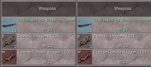 objicon.ORCISH_DAGGER = "tiles/objicon.orcish_dagger.png" 4 7 objicon.DAGGER = "tiles/objicon.dagger.png" 4 7and now I'll see the orcish dagger with its cruder, duller hilt and rusty blade in my inventory.