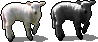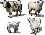 Cow, sheep, lamb, goat: lit from the left, more or less isometric.