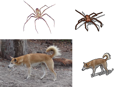 A too-wide image, such as the widely used screencap of the African honey badger, can be narrowed with the graphic editor's "perspective" tool, which can also do wonders for repositioning apparently unusable graphics, such as the rummaging dingo (a free image from somewhere) and the recluse spider (one of the few images from Mr. Packrat with no copyright watermark in it).