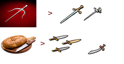 For that matter, the graphic need not exactly be what you want. An ornamental dagger from Dreamstime became a rapier and claymore, while a humble breadknife from 123RF.com, first became, after some shearing and rotating, a family of broadswords, then a scimitar and finally Stormbringer.
