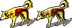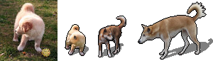 The dingo pup was a Golden Retriever pup, chosen for its dingo-coloured fur and curving tail, with the rummaging dingo's ears pasted on it, which is why the ears are not the best part of the picture. In cases where the tiles are variations on a theme, size is something to think about. Confining images to tiles means that huge monsters will be relatively smaller just to fit, and tiny ones will be relatively large, for the sake of visibility. Still, taking the existing dingo tile as a guide, the pup had to be smaller and the large dingo noticeably bigger.