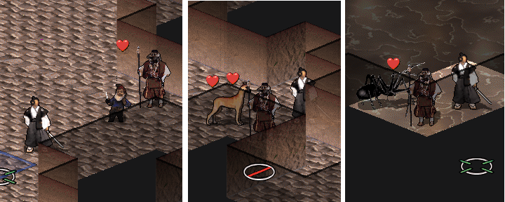 As mentioned under the first heading, tiles may be improperly cropped. As the tengu example shows, this is hardly noticeable, because the coordinates ensure that the tile looks properly centered. So why is it a problem? Because the pet highlight, the little heart over your doggy, kitty, horsy, or, in some rare cases, tengu, takes its coordinates from the top left corner of the tile, which for the tengu pet means that when it's engaging an enemy, it's hard to tell which is the friend and which is the foe.