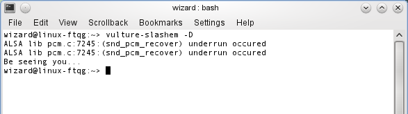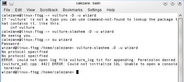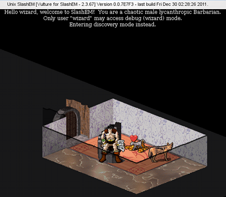 Normally I start a game with an icon in the KDE/Gnome menu, but for wizard mode I would have to start from the console. So here's a screencap of the console output. First, I stupidly used "vulture" before realizing I should have used "vulture-slashem", which got me my chaotic male lycanthropic Barbarian. Next, I created a user "wizard" so I could "su wizard" and try again. This time the result was error messages.