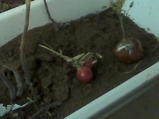 The only picture I could take of the little beefsteak, with the laptop webcam, as the camera was on the fritz. It's the bigger dark lumpy thing on the right.
