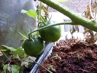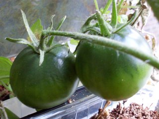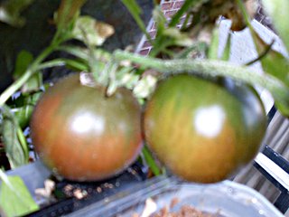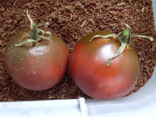 Ripening from green to greyish to violet-brown. The tomato on the left clearly suffered from underwatering, the other was nicely firm and juicy.