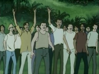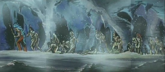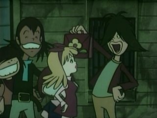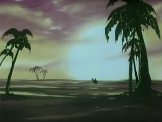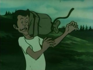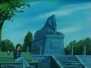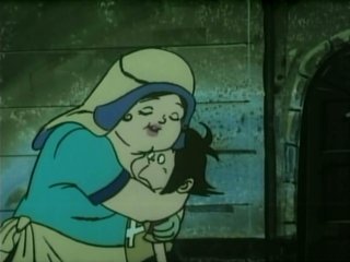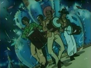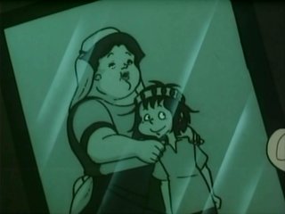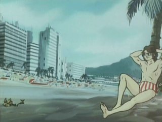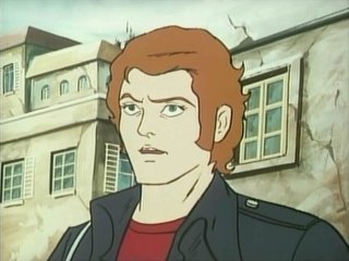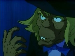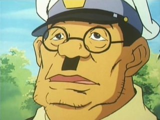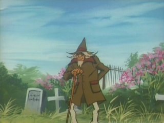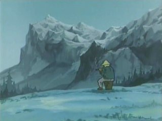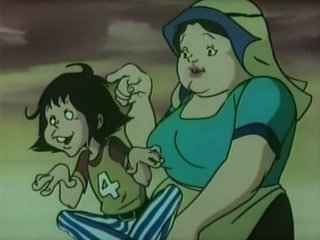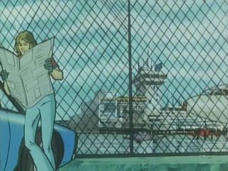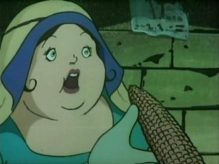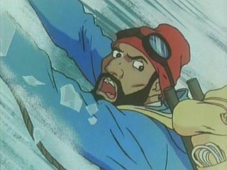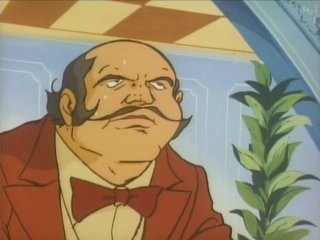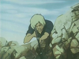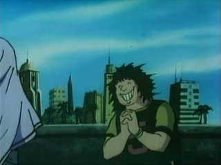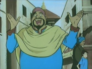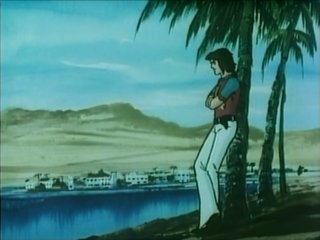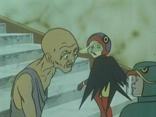 The population is in any case a dubious mix of Caucasian and Japanese. Meet Sabu, Ken's milk-skinned childhood friend and also-orphan who travels as easily to his assumed birthland Huntwall as to the Snack J, suggesting that Utoland and Huntwall are quite close to each other. (I have to admire the way this character was drawn: although he's just another recolour of the male-teen model also used for Koji, Romina and the prince of Ruman, the animators managed to make him look like a total dweeb from beginning to end.)