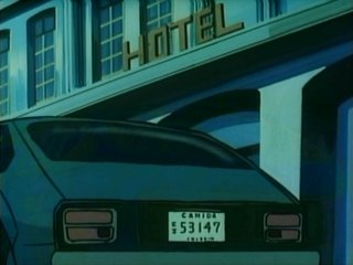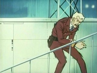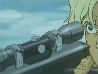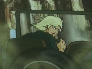 And here is the genuine (as opposed to all those generic quasi-Caucasian extras) gajin: a blue-eyed, fair-haired, gun-toting roadhog who believes in solving everything through violence. The story goes a little deeper than that, but collecting the screen caps, I could see the ethnic/cultural stereotype of "the American" being applied; a stereotype that, colouring apart, doesn't exist only in Japan.