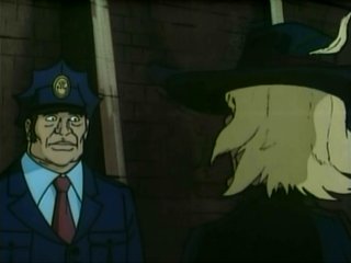 I was going to say "East meets West" in this ep where Mike "fastest gun in the West" Miller is released from what looks like a USA max-security prison - check out the octagonal policeman's cap - into a world he doesn't understand, but really I have no idea what his ethnic background is. The hat with feather looks vaguely non-cattle-country American, but otherwise, I'm just basing myself on his prowess with firearms. One episode guide calls him "sniper", but that's a word I associate with military forces and civil wars; "hired gun" might be a better word.