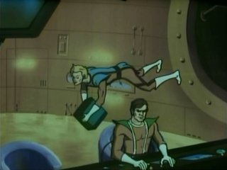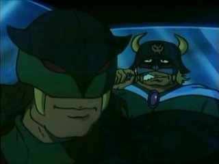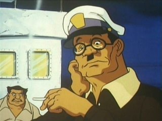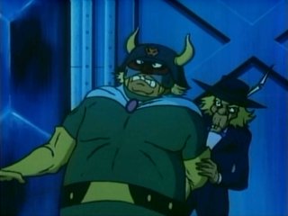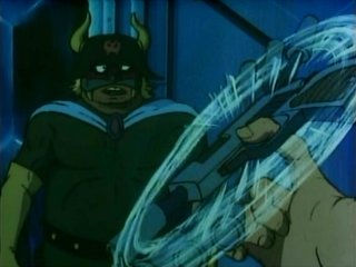 Galactor has also heard of his prowess with firearms, and sends him a special taxi. Has anyone heard of the Scandinavian vacuum cleaner brand "Nilfisk", tub-shaped machines on wheels with a "Nilfisk the Norman" logo featuring a smiling Viking? This Galactor captain reminds me of both the logo and the vacuum cleaner; he has that same tubby build.