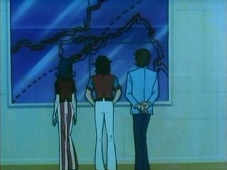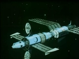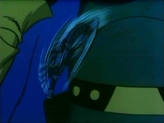 And this is where the "East" bit would come in. The spandex space suits with upturned shoulders - quite different from the genuine astronaut suits in ep 97 - worn in this space station, about to be destroyed to lure out the Gatchateam, are like Russian science fiction film outfits. As usual, the map Nambu projects on a screen to tell the team where it happened is no help; the boundary running between almost-touching landmasses suggests the Bering Strait, but the shoreline is all wrong.