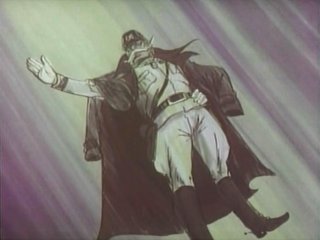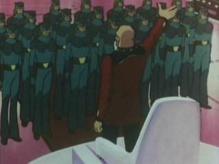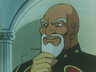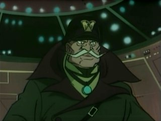 With no flags, maps and landscapes to provide me with clues, I'm wildly stabbing in the dark when I call Doctor Finger Lenin's Manchurian cousin. While I can't identify his clothing as genuine traditional or Communist-era Chinese, it so strongly suggests both that I'm surprised to learn that this martial figure is just another stuffy Galactor scientist. He obviously feels he was made for better things, such as finally and definitely doing away with the Gatchaman team.