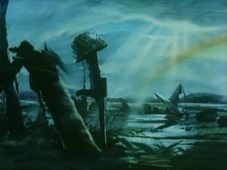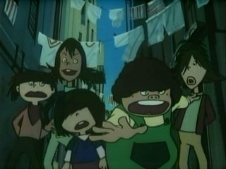 The tenuous but scary connection with Germany's part in World War I & II is continued in the ex-dictator's scheme for revenge: gassing the country through "presents" distributed by the new ruler. However, that's as far as the connection goes. The eternal washing lines behind this gang of street brats to signify that this is a poor neighbourhood, reminds me of Naples - hm, that's Italy, another country that produced a fascist regime - while the uptown gang that steals their present looks like Yakuza material.