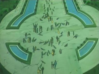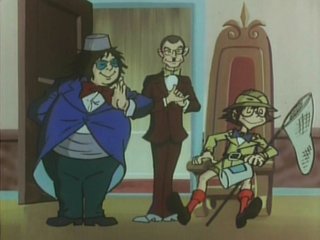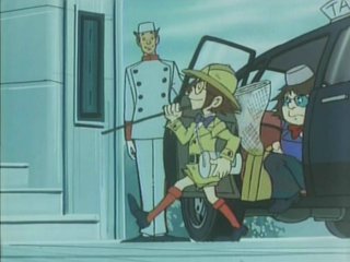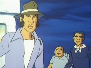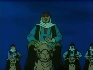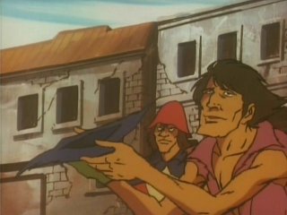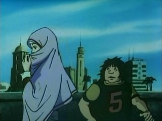 Jinpei and Ryu wouldn't be the Shaggy & Scooby Doo duo they are if they didn't show up in dippy disguises. Meet His Topkapi-ness, the prince of Somewhere-Or-Other, and his fez-bearing chamberlain. Although associated with Turkey, and formerly so popular there that President Ataturk outlawed it in his efforts to westernize the country, the fez is in fact Moroccan, while Jinpei's outfit is that of British colonists in the tropics, hunting anything from ants to elephants. If these outfits are an effort to blend in, their location would be somewhere in Africa. As in Assham, the extras all look Caucasian.