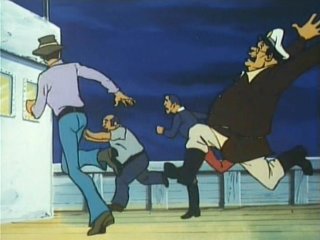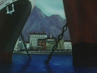 And here's the Cuba connection: corrupt politicians and their nasty, whip-wielding military backup figures (here, fortunately, in the process of being shot) against a background of mahogany bookcases and buildings whitewashed inside and out. However, given that in ep 46, Arthur Kelly escapes the country driving through a snowstorm, Monaco is the more likely model.