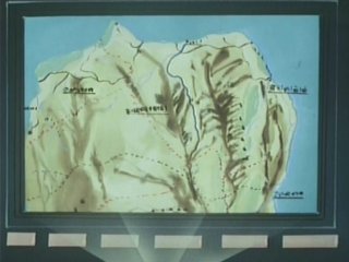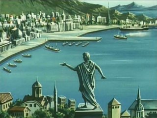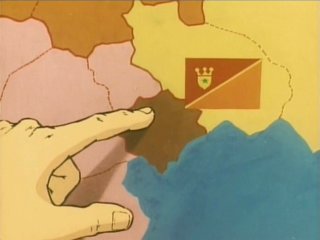On the map, Nambu points out Dokual, a small republic that, when compared with the atlas, might be to the right of Italy, or north of the Black Sea. The toga'd statue would support this, as the Greece of ancient history extended well into Turkey, covering a great deal of Eastern Europe. Dokual might be Rumania, Montenegro... But though the large-scale flag-waving is typical of countries behind the Iron Curtain in the Soviet era, the flags themselves are not terribly helpful.