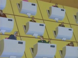 The series itself starts multinationally with Nambu the new president of something or other, addressing world representatives from, er, the first one is your standard Caucasian VIP-in-suit, the second one might be Indira Ghandhi, the third is possibly from Mongolia, the fourth just has to be French (it's the monocle).