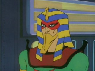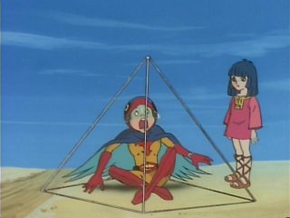 Considering the first-season scriptwriters applied the name "Shosken" to what was clearly Egypt, how did they come up with "Egypt II" for the pyramid-power dream town constructed by someone who, of course, turns out to be a tool of Galactor? The names of both this creep and his daughter are Japanese and I assume they are too, although the daughter, like this ep's Galactor captain, dresses to fit the culture being aped. Although her apparel is that of Bedouin children, as the children of ancient Egypt wore either white cloth tunics or loincloths, or, if they were very young, nothing at all.