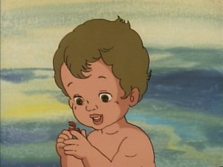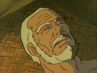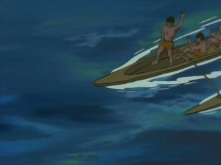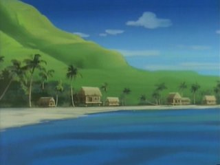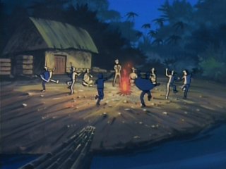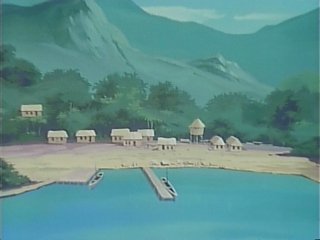 Yes, a small tropical island near the equator, that's all the info given. The peaceful inhabitants, looking very Polynesian and clearly living off fishing (the kind of natives to turn up in documentaries about the Komodo dragon, one of the largest living reptiles) are enjoying life on their paradise island while waiting to be killed in yet another Galactor-induced calamity. In this case it's a snowstorm, and the old man dying on the woven mats of his home shows that old people look pretty much the same anywhere in the world.