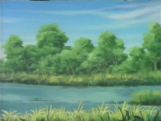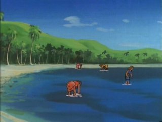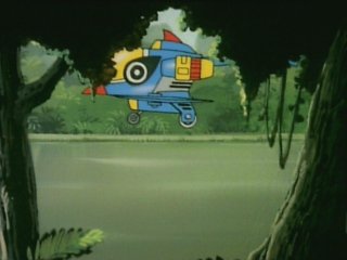 Footage that looks recycled from last season's grasshopper plague ep: the scene is the rain forest of Brazil, where Jinpei is flying low over the mighty Amazon river (just before a giant hosepipe knocks him down and into the river where he is chased by piranhas until a local kid throws him a vine to pull him out of the water).