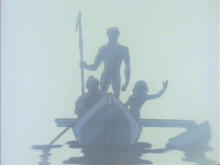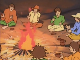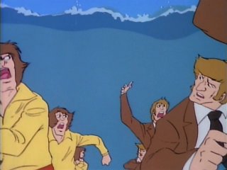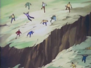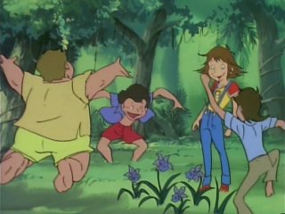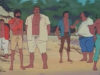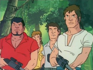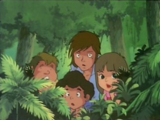 Now the Amazon rain forest, threatened by the logging industry, cattle ranchers and even gold diggers (the gold is extracted from the river bed using nasty polluting chemicals) is home to a number of tribes as threatened as the forest itself (Amnesty International has a pile of dossiers on the situation). I was quite concerned about this until I found out that one such threatened tribe was the Yanömamö, known both locally and internationally for their proud tradition of wife-bashing and infanticide; apparently they prize middle-aged women because hardly any woman in the tribe survives to that age. The bunch of kids who spot Jinpei in trouble don't look like members of any Amazon forest tribe, and neither do the armed men who may seem like Galactors, but are simply concerned parents coming to pick up their kids.