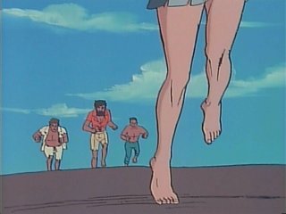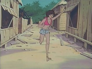 Checking for damage after the crash of some Galactor contraption, Ryu finds a partially destroyed village where a young girl of the trailer trash type is being chased by three other locals for supposedly having something to do with the damage. (If she could cause that sort of destruction single-handedly, how safe is it to chase her?) This is just another pseudo-Polynesian island, the local belle equipped with the Gatch regulation blue eyes (totally out of place here) while the men behind her express: "You know, we were pretty poor and shabby even before Galactor came along and trashed our homes."