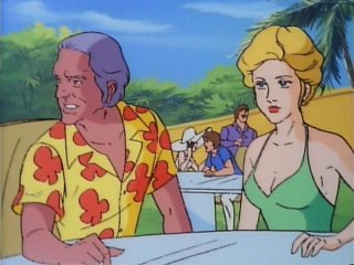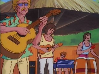 What a contrast to both the shabby place above and the genuine paradise island above that. This is clearly the Gatch equivalent of Hawaii, with surfers, sunburned tourists in flower shirts and bands playing "beach" music - all Caucasian.