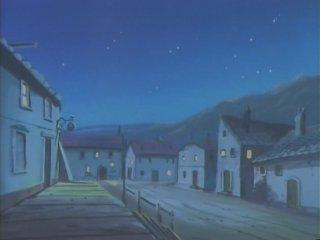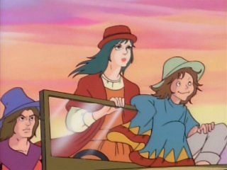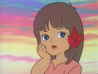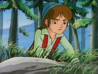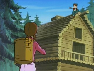 "Way to go, sis! Just a few more logs and the roof will be done!" Okay, that's probably not what the little kid sitting on the Swiss chalet was saying to his big sister "Michi" ("Mitzi"?) in the tranquil alpine haven of natural beauty which of course harbours a Galactor base. The natives' costumes are utilitarian rather than folkloristic: no dirndls, joy.