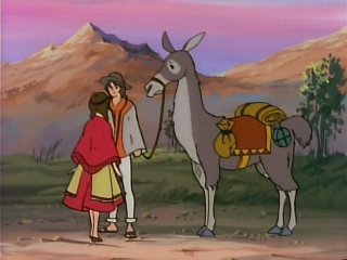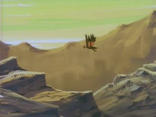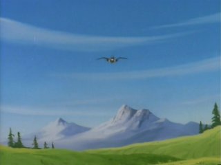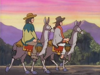 ... the team go sight-seeing, sorry, Galactor-hunting in very folkloristic costumes, three in a jeep, two using a more traditional form of transport. I don't know what Ryu's lama is looking so happy about. I do know that at least one village in Peru has a yearly llama feast where all llamas are dolled up with tassels of wool sewed onto their ears and then chased around town with a heavy load of rocks on their backs to show off their llama muscle. Maybe it's thinking: "hee hee, all that training paid off..."