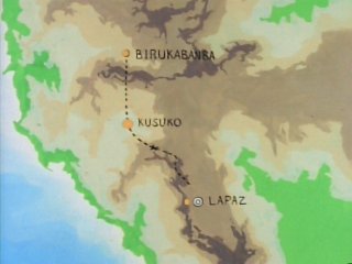 This is the title of the episode! <gag> In the land of the condor (there's that South American connection again) where at least one name on the map is a real existing town (the middle one is how the Japanese pronounce "Cusco", I've no idea what place the topmost name corresponds to)...
