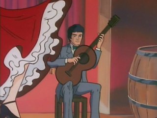 The scene: somewhere near the Strait of Gibraltar. (I happen to know that the inhabitants of Gibraltar are officially British and want to stay that way, and are afraid that Britain will "sell" them to Spain. Crossing the border between Spain and Gibraltar is no light task, and the atmosphere in Gibraltar is hostilely anti-Spanish. Therefore, I conclude that this whole episode takes place in Spain.) After an encounter with Galactor which goes badly for him, a wounded Joe stumbles into a bar where intoxicated locals are watching a flamenco dancer.