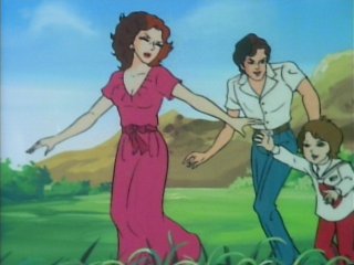 And here is the happy family of Sammy, Sylvie and the regulation Handsome Husband (name: Domingo) enacting their happy family life before an anonymous fourth person with a vidcam, so that Gel Sadra can rewatch these moments just after her mother's death. She, as only member of the family, does have brown eyes.