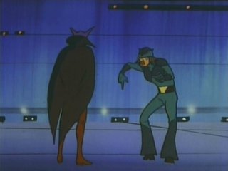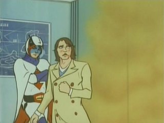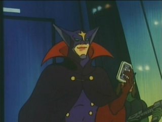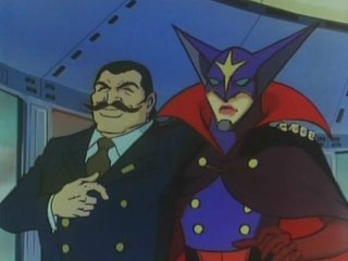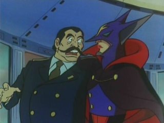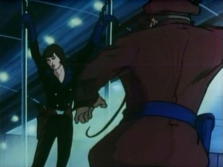 It is only very rarely that a Galactor would deliberately provoke the temper of Berg Katze. And young Koji's last-minute disobedience during a sabotage mission to the Bird Missile factory isn't so much provocation as loyalty to his ex Jun, who, he has just discovered, is fighting on the other side. Whether aware of this or not, Katze - watching the whipping on a viewscreen - shows himself unusually clement.