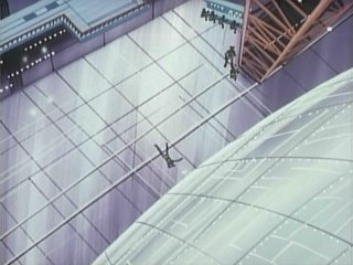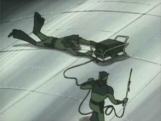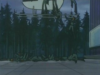 One may be shot by one's leader, used as a live shield, abandoned to die after a failed offensive; or one may have the audacity to slip and fall during a rush job. (It was a rush job. The planet was being fried.) This goon's companion tries to save him, but Katze - showing what a great marksman he is, now why does he almost always miss when shooting at Science Ninjas? - severs the cord with one shot, and the poor goon falls to his death. (Splat.)