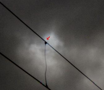This is another if-you-stare-very-hard eclipse photo. The crescent is vaguely visible just above the rather inconveniently placed wire. It's indicated in the cutout by a red arrow nudging it in the back. (Thanks to JPG compression methods, the arrow bled colour into the rest of the pic.)