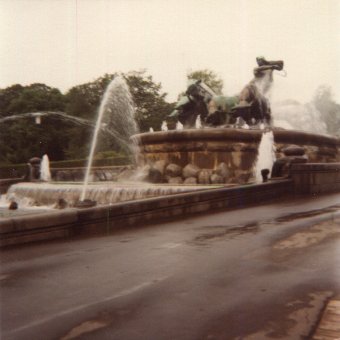 City centre, bronze-o-rama: the usual saluting-horseman statue that probably marks any palacial entry in Europe, and a very large statue, from which I had to back far away to fit all of it in the viewer, of a woman in a chariot pulled by four bulls. I now know the chariot is in fact a plough, and the statue refers to the myth of some (semi-)divinity turning her four sons into bulls to plough off from Denmark's landmass the island of Helgoland.
