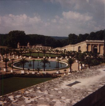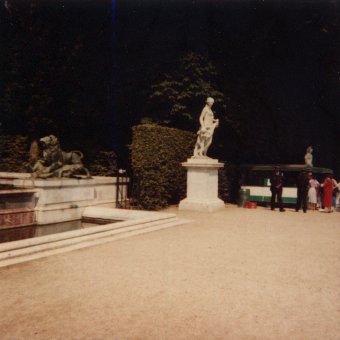 The garden of statues behind the Louvre: a white one, standing out in the shadow, and a lion with an indistinct curly mass underneath; and more bits of palace, as several small palaces with the function of "country cottage" were built around this area.